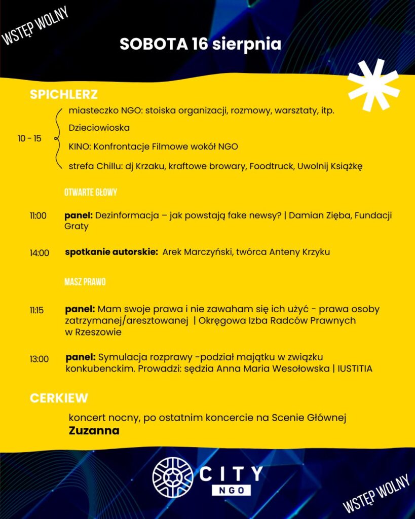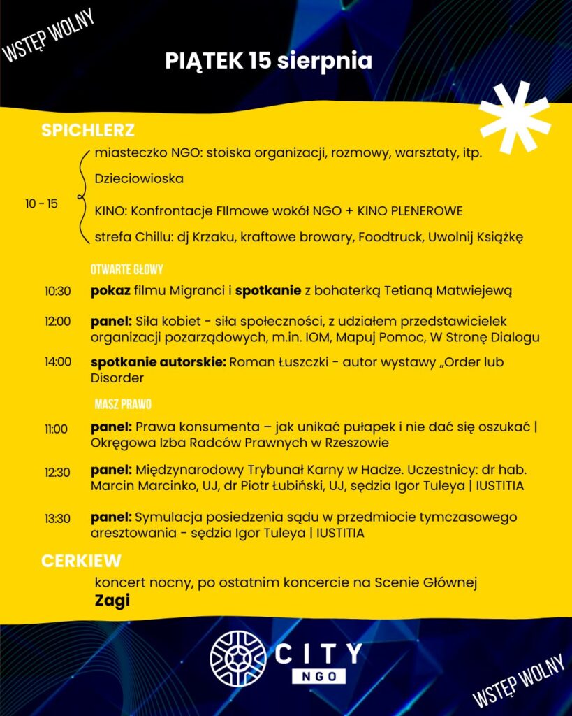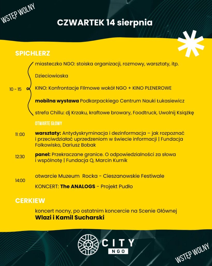 Oprócz występów na scenie tak jak każdego roku w trakcie festiwalu funkcjonować będzie też City NGO. Tym razem przy odnowionym spichlerzu. Jak zwykle w strefie NGO również trzy dni pełne ciekawych inicjatyw i gości. Wiele ciekawych spraw dla dorosłych i też dla dzieci, m. in. dzieciowioska, otwarcie Muzeum Rocka czy symulacja rozprawy sądowej z sędzią Anną Marią Wesołowską.