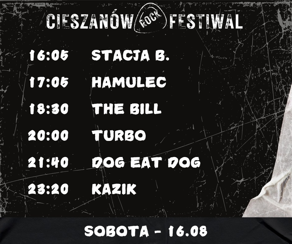 I tu polecamy subiektywnie pod rozwagę Dr Misio, powracający po latach Flapjack oraz Nocnego Kochanka, który grał w Cieszanowie na scenie alternatywnej – konkursowej, później na scenie głównej już jako gwiazda wieczoru i w tym roku znów powraca. A sobota to już muzyczna uczta którą wieńczą na koniec wieczoru: Turbo, Dog Eat Dog i Kazik.
